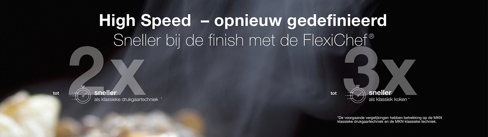 High-Speed gedurende het totale proces – dat is het basisprincipe van de FlexiChef. Door de vele technische innovaties zijn onze ontwikkelaars in staat geweest alle processen nóg sneller te doen laten plaatsvinden. Daardoor zijn u en uw medewerkers in de keuken nog sneller klaar met de kookprocessen en hebben ze kostbare arbeidstijd bespaard. Dat komt door de hoge mate van automatiseren, een snelle bediening en extreem veel power. Hierdoor kan de FlexiChef haar meerwaarde nog meer laten gelden. Uiteindelijk betekent het dat er sprake is van een dubbel zo snelle reactietijd van het bedienconcept en een verbetering van de opwarmtijd met 35 procent (in vergelijking tot voorgaande MKN technologie). Met ReadyXpress High-Speed garen bent u twee keer sneller als bij klassieke drukgaartechniek (in vergelijk met klassiek MKN klassiek drukgaartechniek) en drie keer sneller als bij het klassieke koken (in vergelijk tot klassieke MKN-techniek).