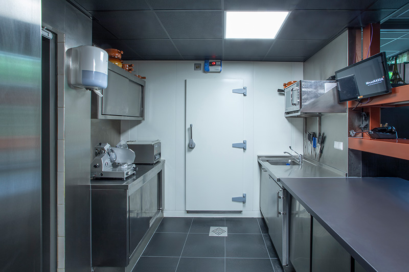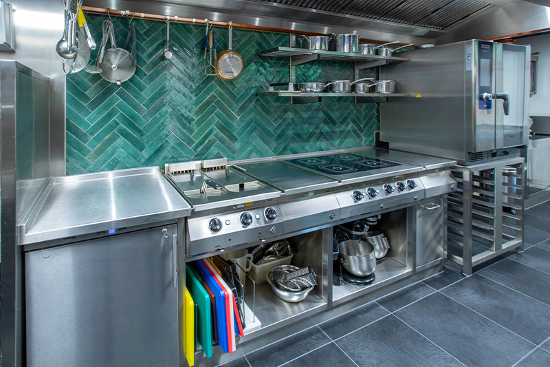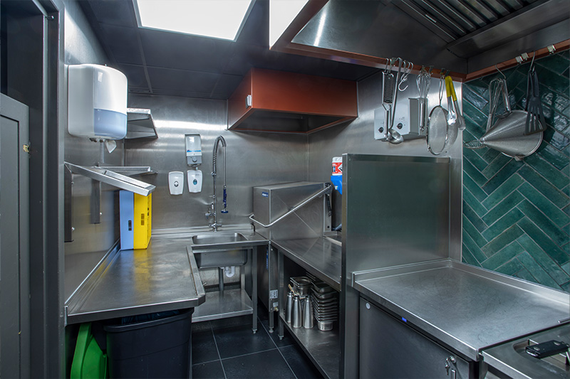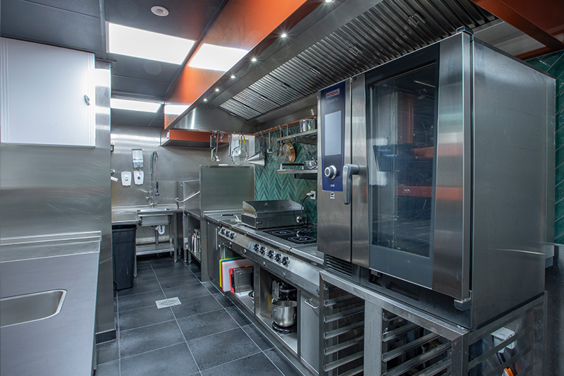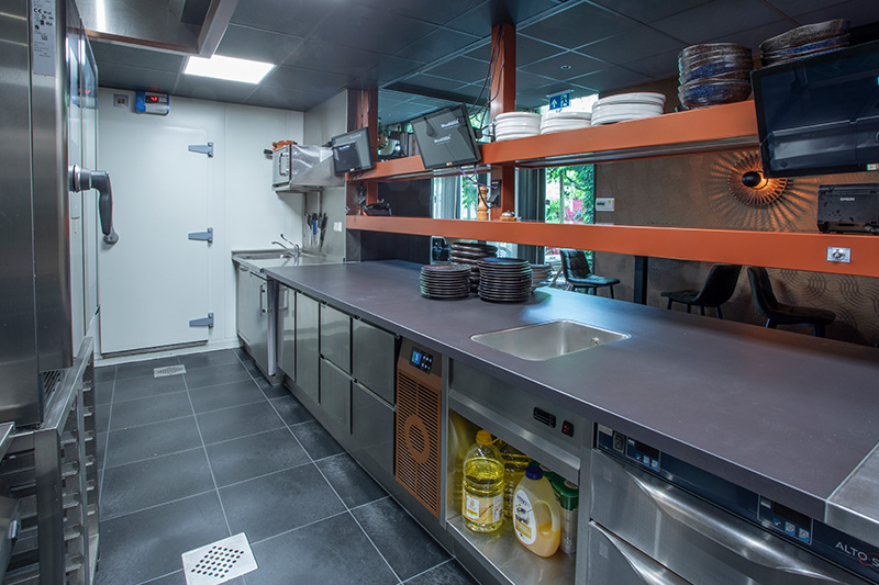 Bij Bistro De Buik van Parijs waan je je compleet in de Parijse sferen. Deze warme uitstraling is zelfs doorgevoerd in de compleet vernieuwde keuken. Van Gestel heeft hier een MKN kooklijn met o.a. een inductieplaat en dubbele friteuse geplaatst. Gecombineerd met de combisteamer is de warme kant compleet. Daarnaast bevindt zich de spoelstraat met Rhima doorschuiver. De warme kant en de spoelstraat zijn beiden voorzien van een, in dezelfde gepoedercoate kleur, afzuiging. Aan de kant van de uitgifte bevindt zich een ingebouwde koelwerkbank, Alto Shaam warmhoudlades en een, eveneens gepoedercoate kleur, etagère. De complete keuken is zelfs voorzien van een koelcel, voor een grote hoeveelheid opslag. Met de tegels op de achterwand en de warme kleur van de afzuiging en etagère komt de Parijse sfeer volledig terug in de keuken.