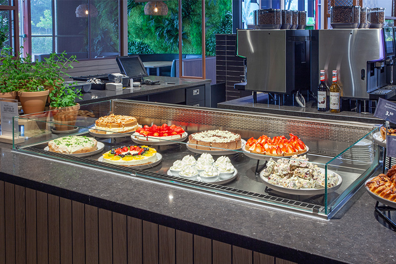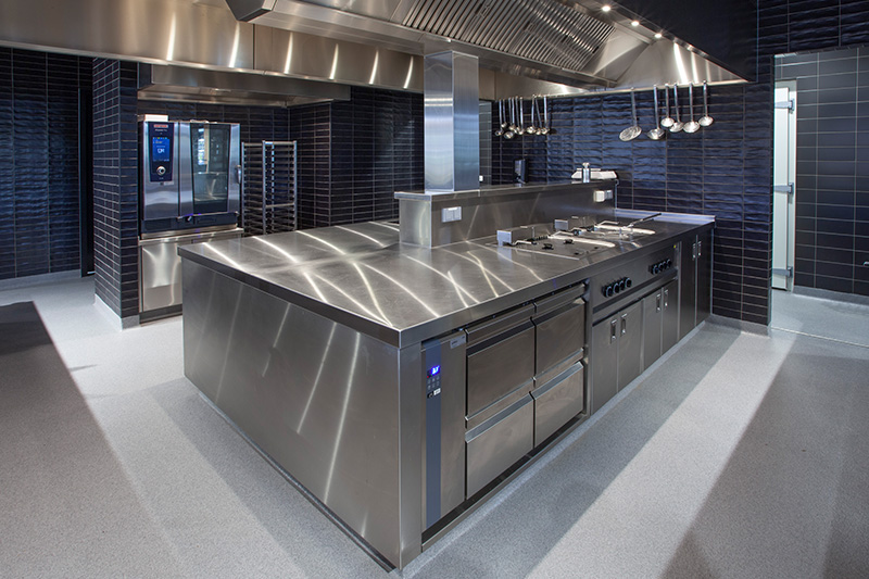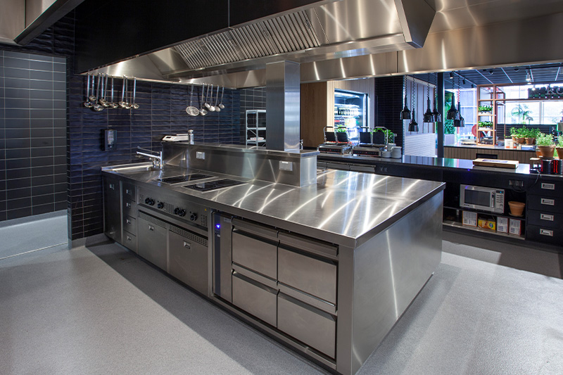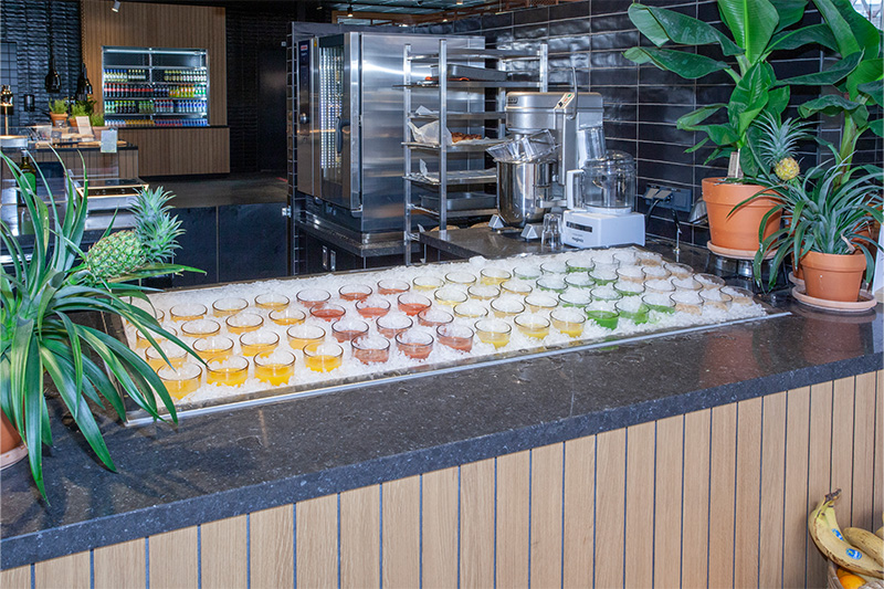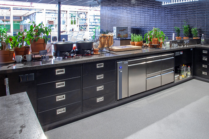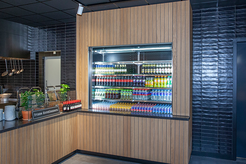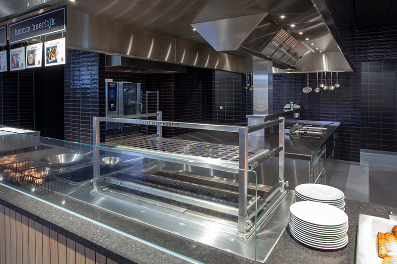 Een open restaurant maakt het mogelijk om voor de ogen van de bezoekers de gerechten te bereiden. De verschillende maatwerk buffetmeubelen die zijn geplaatst, zijn voorzien van inbouw apparatuur. De elektrische lavasteengrill is ingebouwd in een maatwerk rvs meubel. De grill beschikt over drie afzonderlijke verwarmingszones met elk 4,5kW. Ook het wandkoelmeubel is ingebouwd en voorzien van dezelfde uitstraling als de rest van de buffetmeubelen.