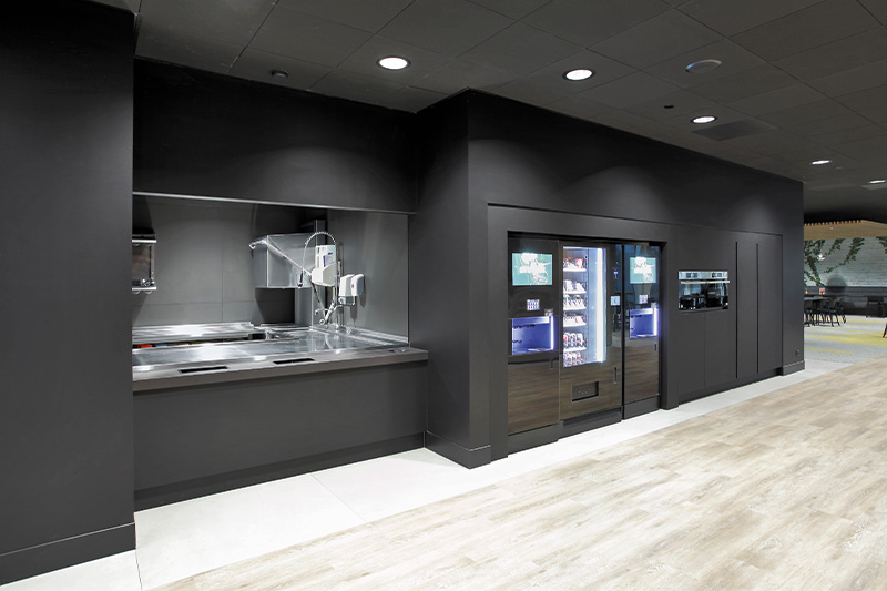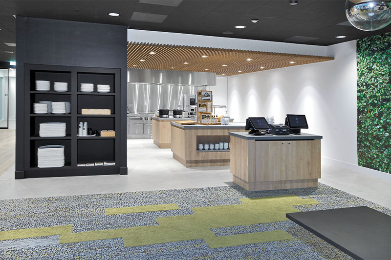 Een andere eis, maar zeker niet onbelangrijk, was dat duurzaamheid centraal moest staan. Het ontwerp zorgt ervoor dat de gasten niet in één lijn lopen, maar door de gehele ruimte waar de cateraar werkt. Op deze manier is het toegankelijker voor iedereen en is er rekening gehouden met het voedselveiligheidssysteem HACCP.