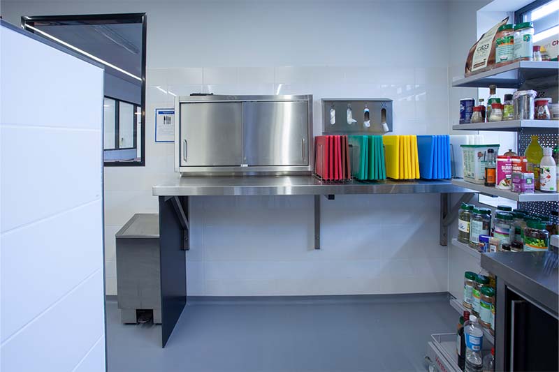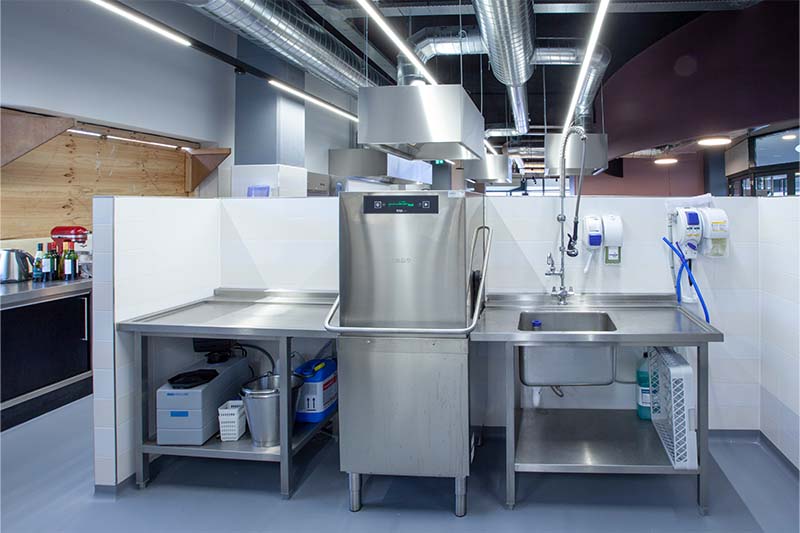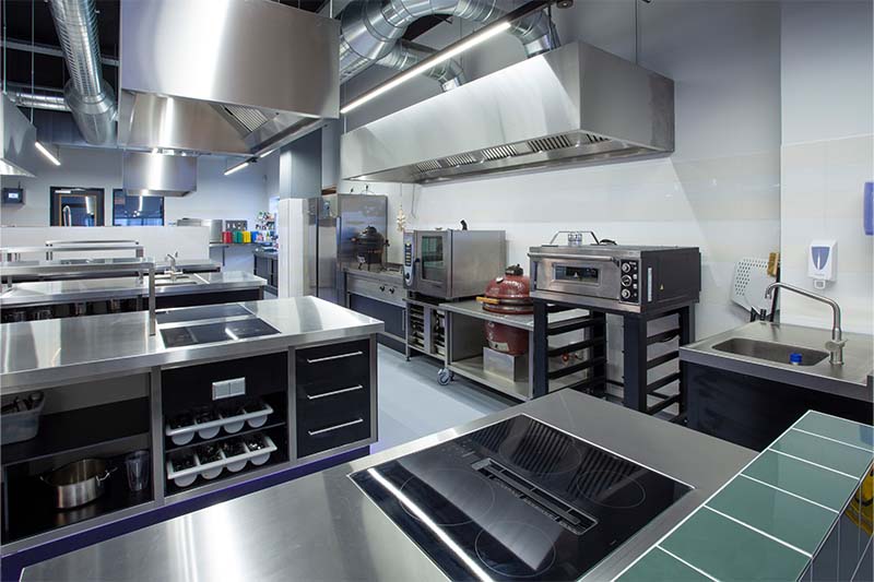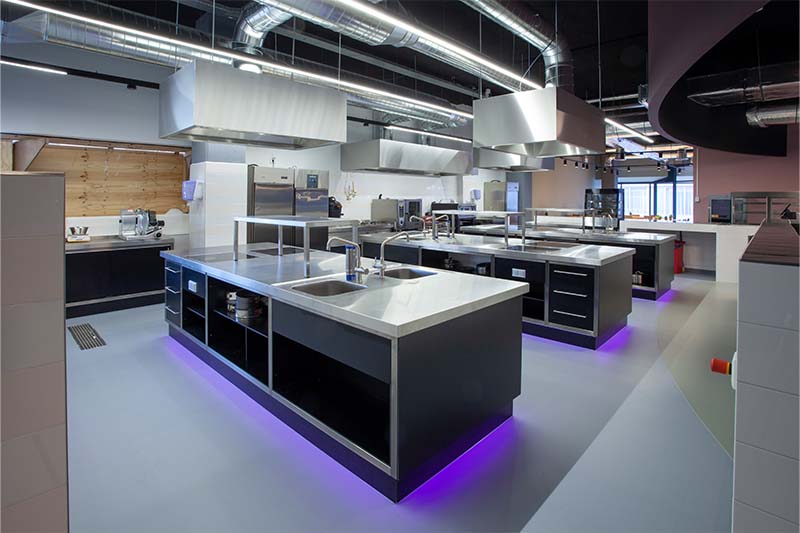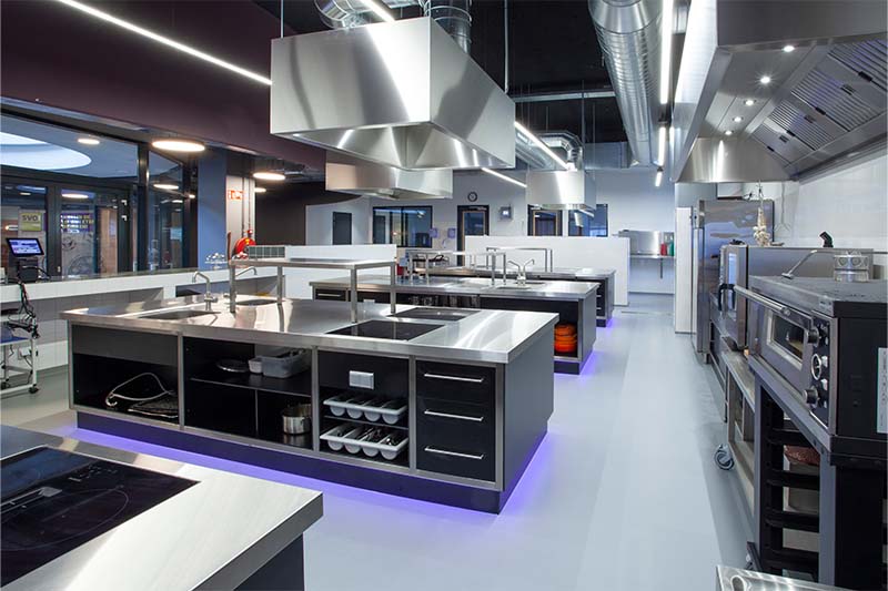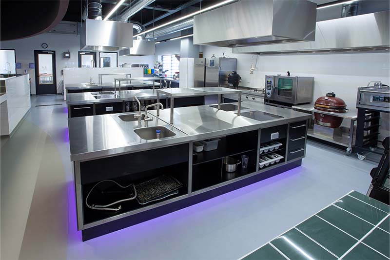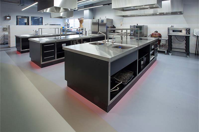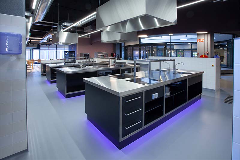 Met de lesunits wordt de praktijk optimaal gesimuleerd. De units beschikken over een vlakdekkende inductie die gelijk is met het werkblad. Daarnaast is de keuken voorzien van de laatste trends, met onder andere een een iDeck pizzaoven van Moretti Forni. Ingebouwde koel- en warmhoudvitrines, een combisteamer, diverse koel- en vrieskasten en een houtskoolgrill zorgen er mede voor dat de studenten van SVO perfect klaargestoomd worden voor de praktijk!