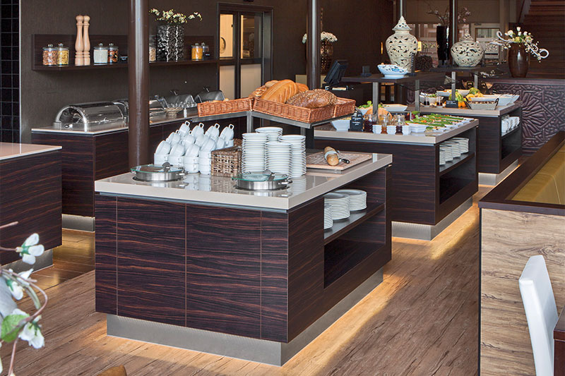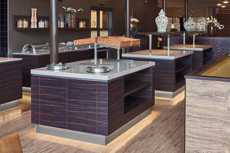 “De uitdaging zat hem in het ontwikkelen van een goede routing waarin de diverse disciplines, a la carte, buffetten en diner, elkaar niet tegen komen tijdens de bereiding en uitgifte. We hebben duidelijk gezocht naar een routing waarin de mise en place en het uitgiftemoment elkaar niet verstoren.”